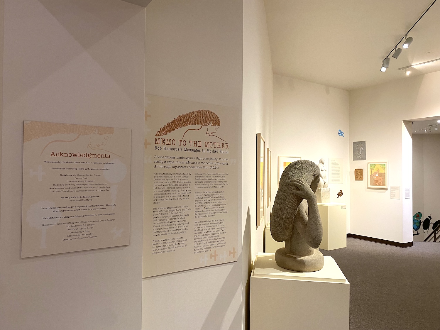Exhibition signage design for the Wheelwright Museum of the American Indian’s Memo to the Mother: Bob Haozous’s Messages to Mother Earth. The main exhibition graphic, as seen on the intro panel, is derived from an element of a jewelry piece by Bob Haozous. Other graphics pull from his work, including crosses, planes, trees, and clouds. The headings and quotes utilize American Typewriter ITC Pro, as a reference to the stamped letters in his jewelry designs. The body font is Public Sans, which is also used for the label designs.